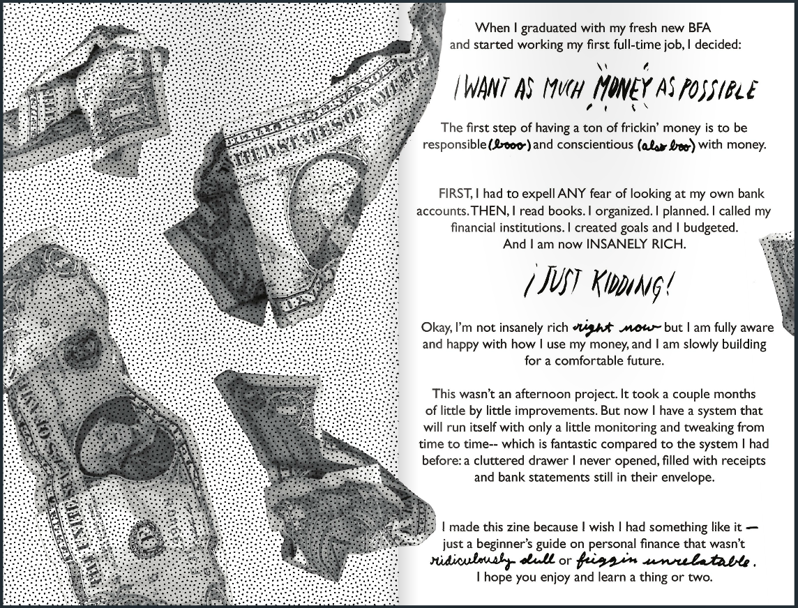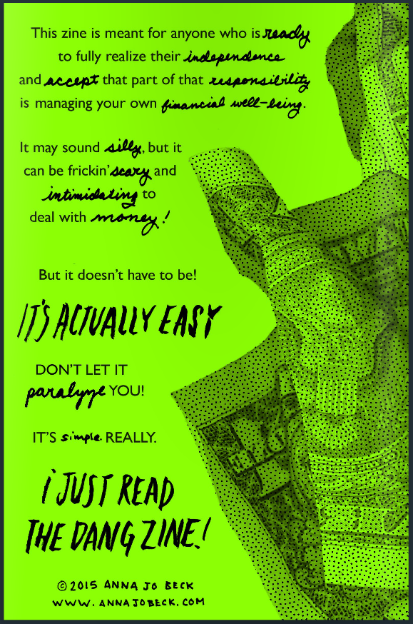 Let Biff Boff Bam Sock's not boring and very important introduction to personal finance guide you through the perils of not knowing what to do about your money! This zine is aimed for people who are new to handeling their own finances and would like some no nonsense basics in a friendly tone. It’s a bear bones guide on how to approach checking, credit cards, budgeting, and investing, that (once again) isn’t dreadfully boring